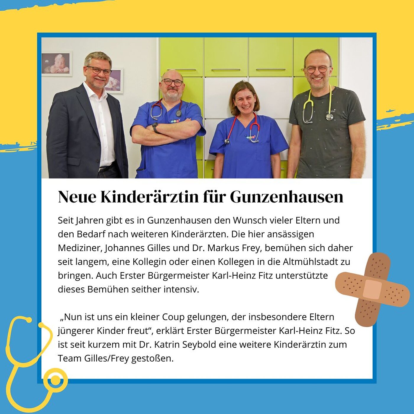 Gunzenhausen wächst und entwickelt sich prächtig. Mit steigenden Einwohnerzahlen steigt aber auch der Bedarf an medizinischer Grundversorgung. Seit Jahren gibt es in Gunzenhausen den Wunsch vieler Eltern und den Bedarf nach weiteren Kinderärzten. Die hier ansässigen Mediziner, Johannes Gilles und Dr. Markus Frey, bemühen sich daher seit langem, eine Kollegin oder einen Kollegen in die Altmühlstadt zu bringen. Auch Erster Bürgermeister Karl-Heinz Fitz unterstützte dieses Bemühen seither intensiv.