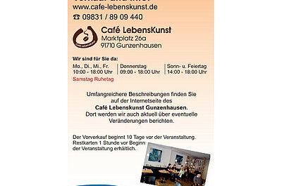 Wir laden Sie ein, in unserem Café Lebenskunst Platz zu nehmen, sich in Ruhe umzuschauen und den Raum auf sich wirken zu lassen. Sie befinden sich in einem historischem Gebäude, in dem im letzten Jahrhundert Druckerzeugnisse hergestellt wurden. Draußen im Innenhof befindet sich noch das Werbeschild der Druckerei Tuffentsamer. Im Jahre 2010 entwickelte die Lebenshilfe Gunzenhausen die Idee, ein integratives Café für die Bürger in Gunzenhausen zu betreiben. Mit einem mutigen Schritt entschloss sich der Vorstand im März des Jahres 2011, das Kulturcafé „Café Lebenskunst“ einzurichten und es konnte am 25. Juli 2011 eröffnet werden.
