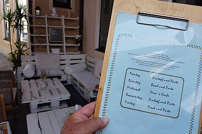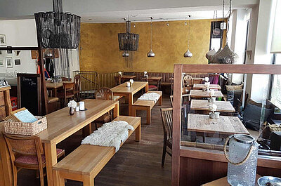 Auf die Gäste, die im Restaurant (40 Plätze) oder im betont individuell eingerichteten Nebenzimmer Platz nehmen oder auf der Terrasse (70 Plätze) verweilen, wartet eine Auswahl von kulinarischen Spezialitäten. Sie begeistern sich für den dünnschichtigen Flammkuchen genauso wie für den dicken Burger. Auf den Tisch kommen ausgewählte Weine von internationalen Erzeugern.