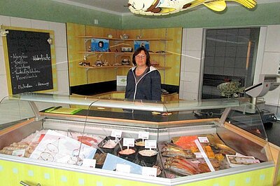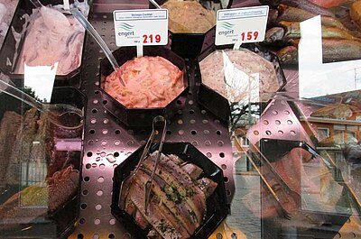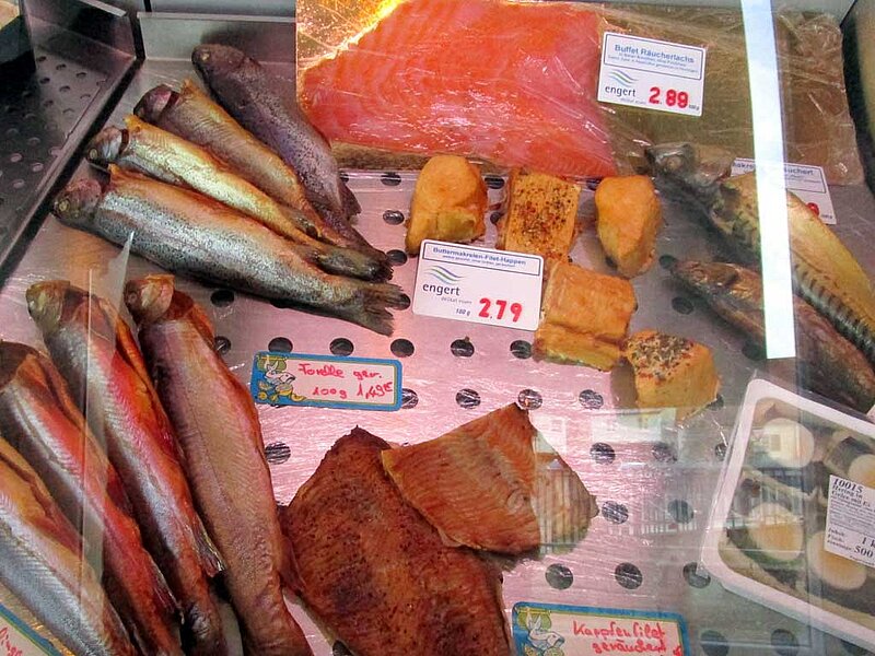 Wechselnde Auswahl an Seefischen, Fischsalaten sowie Räucherfischen.