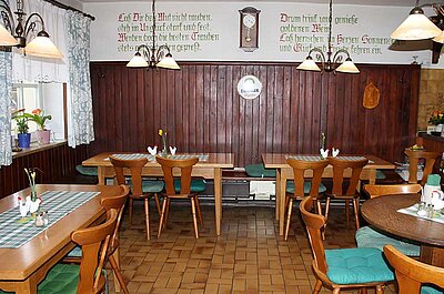 In unserer Fränkischen Weinstube mit ihrer romantischen, von Weinreben umrankten Laube, servieren wir Ihnen Fränkische Spezialitäten: hausgemachte Gunzenhäuser Bratwürste, Bauernschinken und selbst angemachten Käse. Dazu einen Frankenwein oder ein herzhaftes Bier aus der Region.
