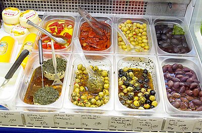 Die Feinkost-Theke bietet all das, was die Feinschmecker gerne konsumieren: Türkische und griechische Käsespezialitäten sowie eingelegte Früchte für den leckeren Vorspeisenteller.