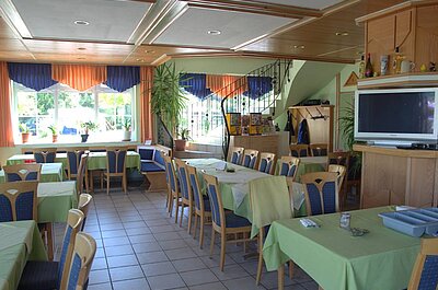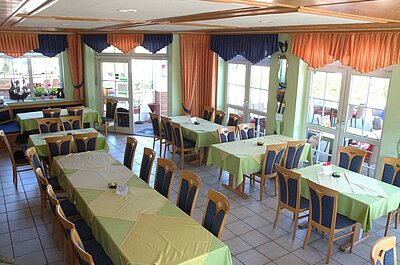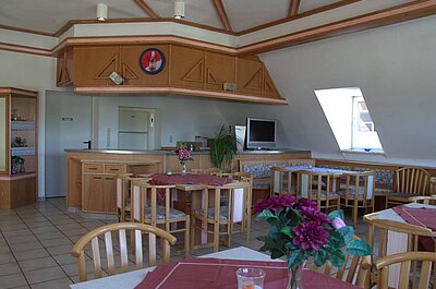 Das Restaurant am Eingang des Campingplatzes ist sehr ansprechend gestaltet. Im 1. Stock gibt es noch die Möglichkeit, Familienfeiern auszurichten. Die Terrasse ist besonders beliebt, vor allem in den Abendstunden, denn in dieser Zeit lässt sich der Sonnenuntergang stimmungsvoll genießen. Nicht nur für Camper gilt das Angebot des Morgens: Frühstück von 9 bis 10 Uhr.