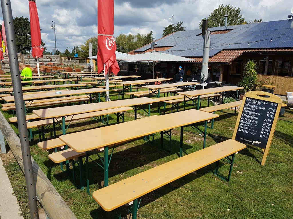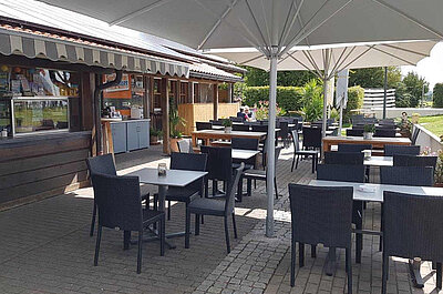 Für Erholung sorgt das Terrassencafé mit Seeblick (250 Plätze). Im Innenbereich gibt es Platz für 35 Gäste, die sich selbst bedienen. Hier genießen die Gäste neben ausgewählten kulinarischen Köstlichkeiten vom Biergarten aus einen traumhaften Blick auf den See und die Action der Kiter und Surfer. Frühstück und Brötchen gibt es täglich bereits ab 7.30 Uhr am Kiosk, warme Küche ab 11 Uhr.