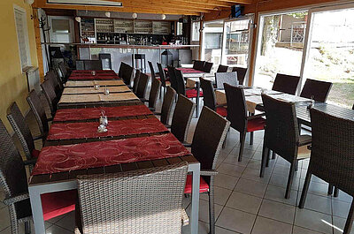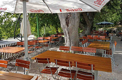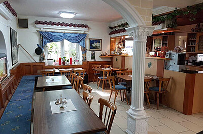 In den drei Gasträumen können an die 100 Personen Platz finden. Die Lokalität ist typisch griechisch dekoriert. So überwiegen die Farben Weiß und Blau. Der eigentliche Hit ist jedoch der Biergarten direkt am Haus und unter sieben schattigen Lindenbäumen. Hier lässt es sich vorzüglich verweilen. Der Gastwirt, der längst zum gastronomischen Stamm der Stadt gehört, bietet griechische und deutsche Küche an.