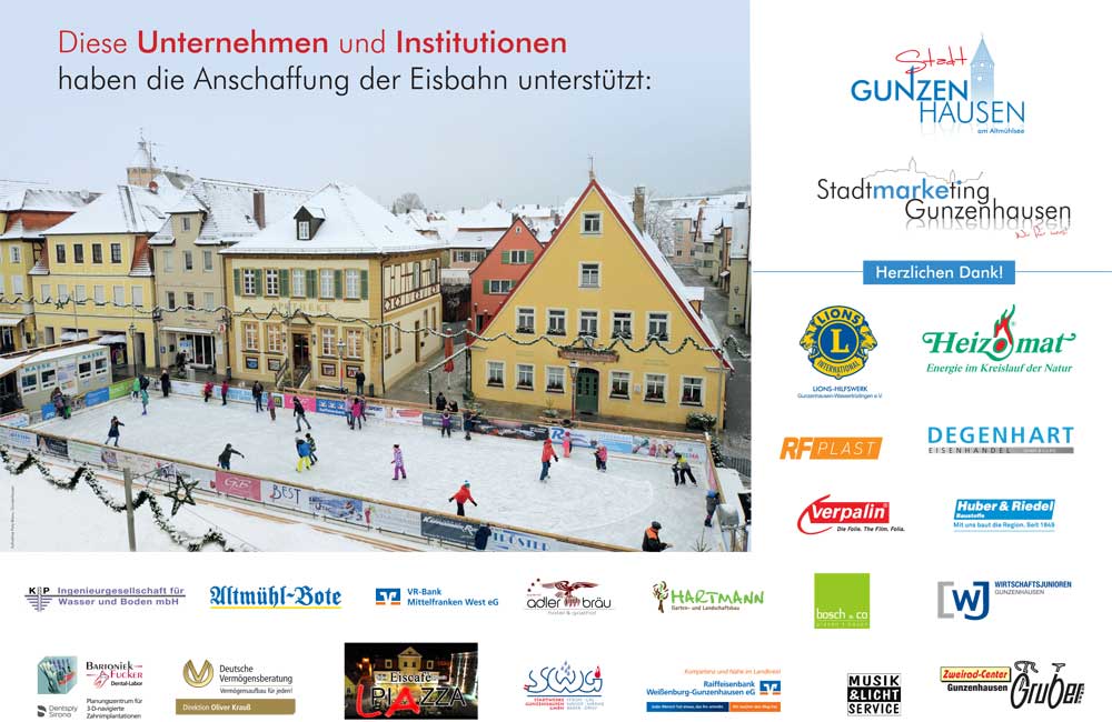 Seit 2014 findet jedes Jahr am Marktplatz in Gunzenhausen die Eisbahn statt. Von Mitte November bis Anfang Januar gibt es 300qm Eis mitten in der Altstadt. Dabei ist die Eisbahn unter der Woche vormittags für Schulkassen geöffnet, einmal die Woche mittags nur für Senioren und ebenfalls einmal die Woche abends zum Eisstockschießen. Außerdem bietet die Eisbahn eine Vielfalt an Attraktionen – angefangen vom Nikolaus auf der Eisbahn über das Event Tanz-klar bis hin zur Eisbahn-Olympiade. In der dunklen Jahreszeit gibt es ein spaßiges Vergnügen für die ganze Familie, die Möglichkeit zum Schlittschuhleih besteht. Informationen finden Sie unter http://eisbahn.gunzenhausen.de.